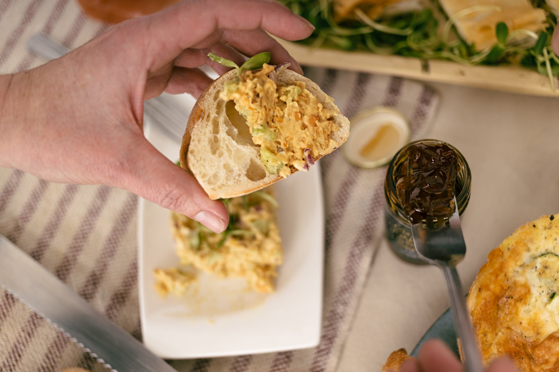 Ingrédients : Pois chiches, céleri, oignons rouges, levure nutritionnelle, mayonnaise, ail, sel et poivre.